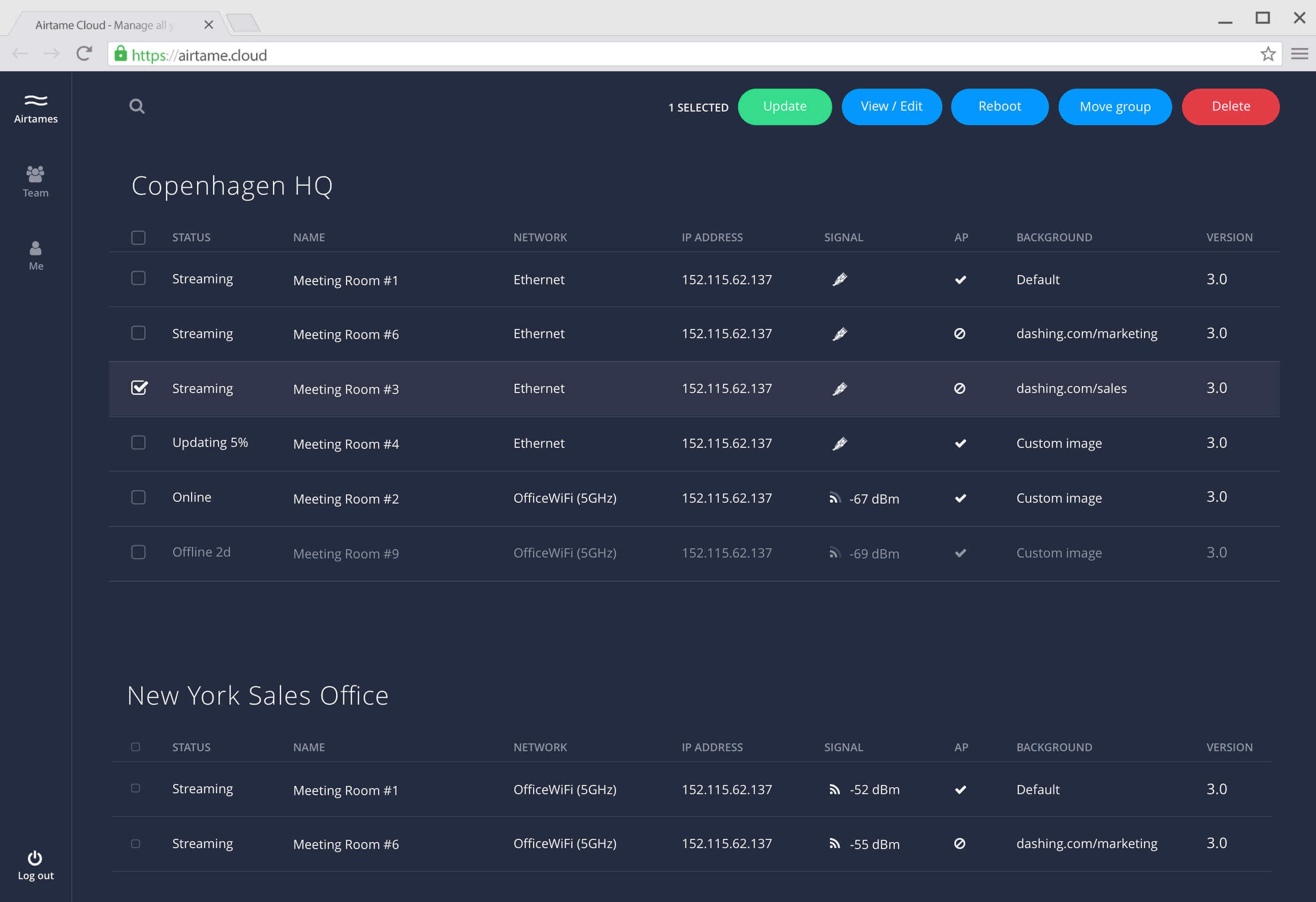 Airtame Cloud gives you important details about the device like its IP address, signal quality, the network it’s on, whether it’s being used for digital signage or currently streaming. These details make a world of difference for an IT admin and they can control a lot of things right from their desk.