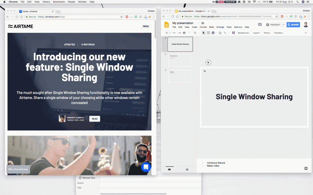 If you want to keep some windows concealed and private while presenting, Airtame 2 has a feature called Single Window Sharing that will allow you to choose which specific window to stream and which to keep hidden.