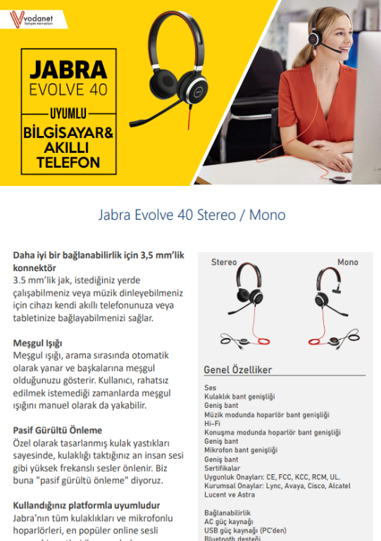 Jabra Evolve 40 kulaklık ile ilgili ürün brosürü ve kullanım kılavuzuna asagıdaki linklerden ulasabilirsiniz. Uyumluluk ve diger teknik sorularınız icin 0216 340 76 40 bizi arayabilirsiniz.