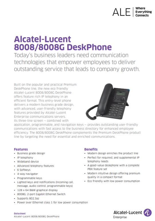 Alcatel-Lucent 8008/8008G ip masaüstü telefon makinası ile ilgili ürün brosürü ve kullanım kılavuzuna asagıdaki linklerden ulasabilirsiniz. Uyumluluk ve diger teknik sorularınız icin 0216 340 76 40 bizi arayabilirsiniz.