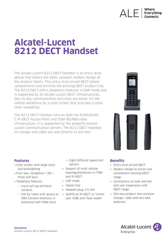 8212 DECT Ahize hem 8318, 8318 IP-DECT Erişim Noktasında hem de 8379, 4070 TDM IBS / RBS baz istasyonlar ile uyumlu çalışmaktadır. Alcatel-Lucent'ın güçlü iletişim sunucuları tarafından desteklenmektedir. 8212 DECT Ahize, şarj cihazı ve kablosu doğrudan tek bir kutuda satılır.