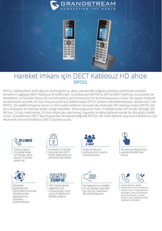 Grandstream DP750 DECT Baz İstasyonu uyumlu olan DP722 kablosuz Dect telefon her DP750 antene 5 adet DP722 ahize tanımlanabilir. DP750 baz istasyonundan dış mekanda 300 metre ve iç mekanda 50 metre kapsama alanını destekler. El cihazı başına en fazla 10 SIP hesabı tanımlanabilir. Ahizesiz görüşmeyi sağlayan hoparlörde ve ahizede Full HD ses kalitesi sunan Grandstream DP722 el telefonu 3,5 mm kulaklık girişi ile yoğun görüşme yapan kullanıcılar için mükemmel bir yardımcıdır. 3 katılımlı sesli konferans, otomatik provizyon seçenekleri arasında TR-069 ve XML yapılandırma dosyaları bulunur.