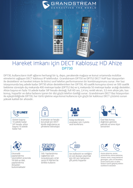 Grandstream DP750 DECT Baz İstasyonu uyumlu olan DP730 kablosuz Dect telefon her DP750 antene 5 adet DP730 ahize tanımlanabilir. DP750 baz istasyonundan dış mekanda 300 metre ve iç mekanda 50 metre kapsama alanını destekler. El cihazı başına en fazla 10 SIP hesabı tanımlanabilir. Ahizesiz görüşmeyi sağlayan hoparlörde ve ahizede Full HD ses kalitesi sunan Grandstream DP730 el telefonu 3,5 mm kulaklık girişi ile yoğun görüşme yapan kullanıcılar için mükemmel bir yardımcıdır. 3 katılımlı sesli konferans, otomatik provizyon seçenekleri arasında TR-069 ve XML yapılandırma dosyaları bulunur.