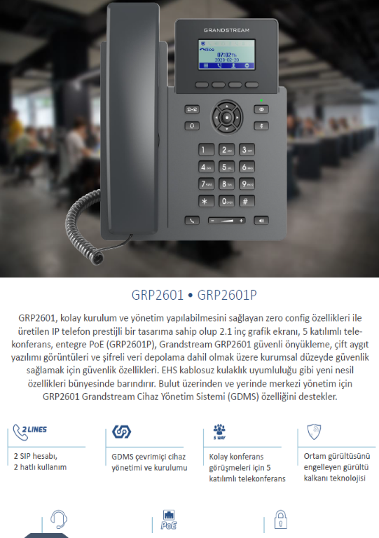 “Carrier Grade” ürün kalitesinde üretilen GRP2601 IP telefonun temel özellikler arasında 2 SIP hesabı 2 hat ile kullanım, 2.21 inç 132x48 piksel geniş LCD ekranı ve ahizesiz görüşme bulunmaktadır.