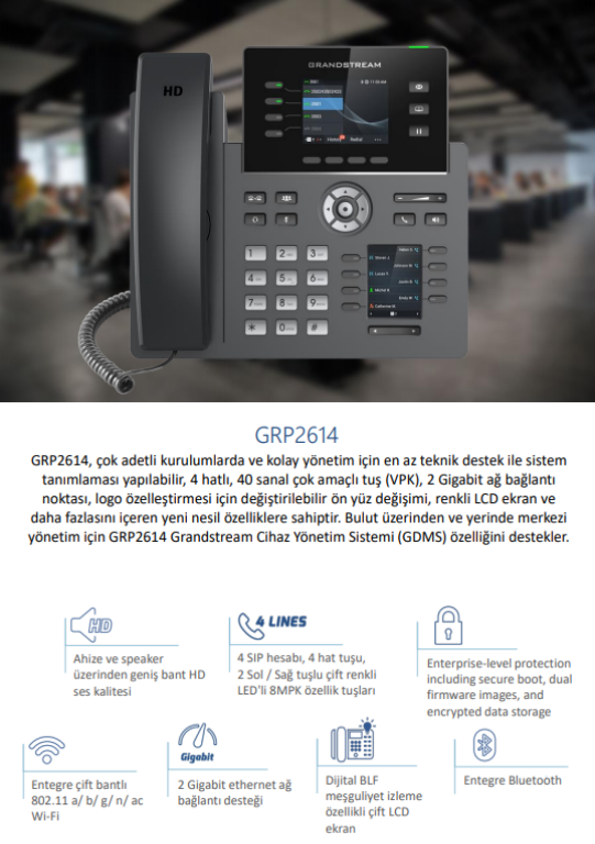 "Carrier Grade" ürün kalitesinde üretilen GRP2614 IP telefonun temel özellikler arasında 4 hat ile kullanım, 2.8 inç 320x240 piksel geniş renkli ekranı ve 2.4 inç 320x240 ilave yardımcı ekran, değişebilen ön paneli ve 40 adet VPKs sanal programlanabilir tuş yer almaktadır.