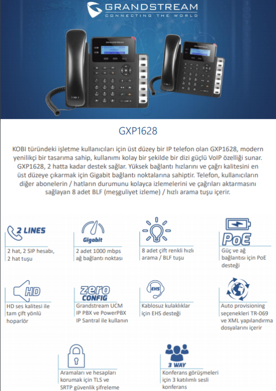 Hızlı ağ erişimi ile standart iletişim desteği gerektiren masaüstü kullanıcıları için güçlü bir Gigabit telefon seçeneği olan GXP1628, net ses kalitesi ve kolay çağrı kontrolü sağlamak için temel çağrı özelliklerini ekonomik satınalma maliyeti ile kullanıcısına sağlar. 132x48 arkadan aydınlatmalı geniş LCD ekranı ile kolay kullanım imkanı sunar. Grandstream GXP1628 kullanıcı dostu ve kaliteli bir masaüstü telefon ihtiyacı duyan kullanıcılar için mükemmel bir seçimdir.