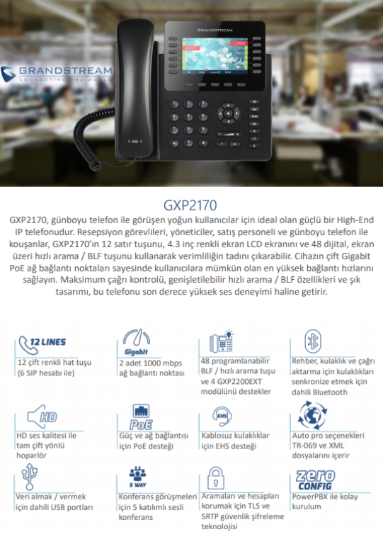GXP2170, firmalarda tepe yöneticiler ve çok yoğun telefon görüşmeler ile adeta günü bitiren profesyonel çalışanlar için ideal olan güçlü bir High-End IP telefonudur. Resepsiyon görevlileri, yöneticiler, satış personeli ve telefon ile gün boyu yoğun görüşen çalışanlar GXP2170'ın 12 hat tuşunu, 4.3 inç renkli ekran LCD ekranını ve 48 dijital ekran üzeri hızlı arama / BLF tuşunu kullanarak verimliliğin tadını çıkarabilir. Grandstream GXP2170 çift Gigabit PoE ağ bağlantı noktası sayesinde kullanıcılara mümkün olan en yüksek bağlantı hızlarını sağlar. Maksimum çağrı kontrolü, genişletilebilir hızlı arama / BLF özellikleri ve şık tasarımı, bu telefonu son derece yüksek ses deneyimi haline getirir.