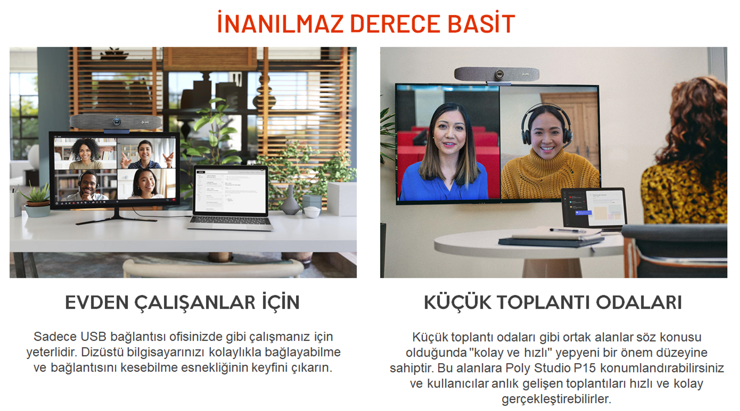 USB tak ve çalıştır bağlantı desteği ile Poly Studio P15, küçük toplantı odaları ve yönetici ofislerinde optimum çözüm arayan profesyoneller için tasarlanmıştır.