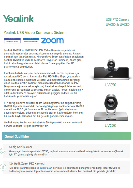 Yealink UVC80 video konferans sistemi 10 kişilik ve daha büyük toplantı odaları için uygun fiyatlı yeni nesil video konferans sistemidir. Otomatik resim çerçeveleme ve kablosuz mikrofonları ile UVC80 video konferans kamerası 1920x1080p 60fps, 12x optik yakınlaştırma özellikleriyle Yealink markasının en iyi ürünüdür.