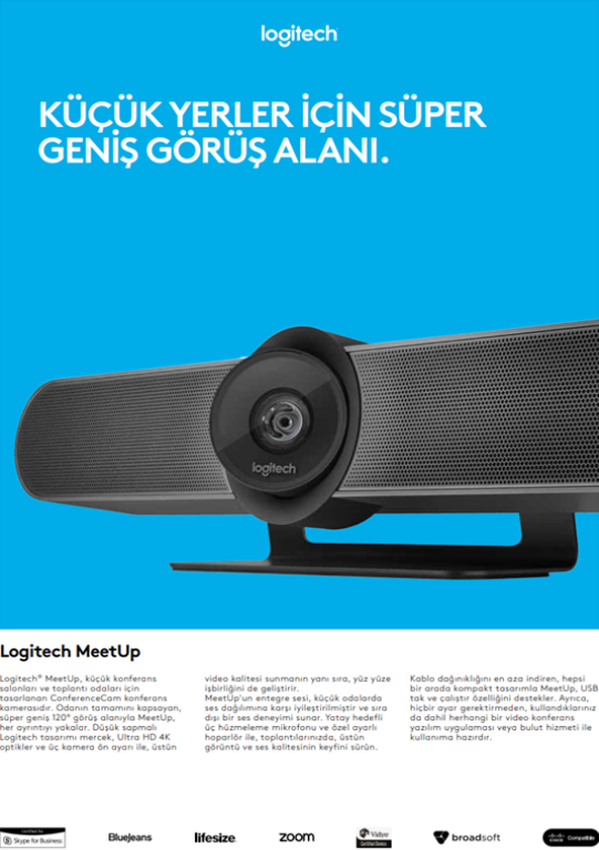 Küçük ve orta büyüklükteki toplantı odaları için tasarlanan Logitech MeetUp, tüm video konferans iletişim özelliklerini kompakt bir yapı ile üzerinde barındırır. 5x yakınlaştırma özellikli 4K Ultra HD kamera, HD ses kalitesi sunan hoparlör sistemi, gürültü ve yankı önleme özellikli çok yönlü üç adet mikrofon, hareketli pan-tilt özellikli mercek. MeetUp ekrana bir soundbar gibi takılır ve hoparlörü masadan kaldırarak oda boyunca uzayan kablolardan kurtulur ve kullanılabilen alanı maksimum boyuta çıkarır.