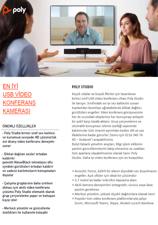 Küçük odalar ve büyük fikirler için tasarlanan birinci sınıf USB video konferans kamerası Poly Studio ile tanışın. Poly Studio, kullanımı kolay bir USB video konferans kamerası sınıfının en iyisi ses ve görüntü kalitesini sunar. Düşük satınalma maliyeti ve zengin USB kamera özellikleri için Poly Studio USB video onferans kamerasını tercih edebilirsiniz. Sınıfındaki en iyi ses kalitesini sunan toplantıları kesintiye uğratabilecek dikkat dağıtıcı sesleri engeller. Video konferansın her iki ucundaki ekipler anlaşılır ve yüksek çözünürlüklü görüşmeler yapar. Grup çerçeveleme ve otomatik hoparlör izleme sayesinde tüm önemli ayrıntılar beden dili ve yüz ifadelerini karşı tarafa yansıtabilirler. Bulut tabanlı yönetim araçları ile versiyon güncellemeleri ve ayarları uzaktan yapmaya imkan tanır.